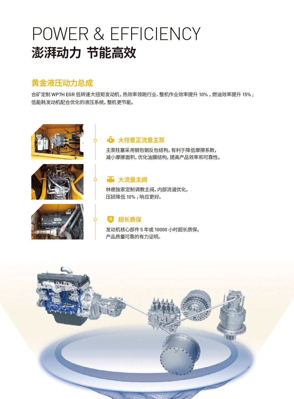 HK945FC搭載了合礦定制的WP7H EGR低轉速大扭矩發動機,這款發動機以其出色的熱效率和行業領先的性能,使得整機作業效率提升了10%,燃油效率更是提升了15%。配合大排量正流量主泵和大流量主閥,進一步優化了液壓系統,實現了更低的能耗和更高的作業效率。此外,發動機核心部件享有5年或10000小時的超長質保,彰顯了合礦對產品質量的自信。